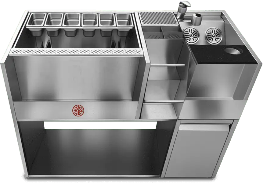 Every 52″ standalone stainless steel cocktail bar station is composed of critical elements engineered to support mixology workflows while ensuring hygiene and durability. Core components include ice bins, cold plates, speed rails, bar sinks, drainboards, blender slots, and garnish wells. Each feature contributes to a cohesive preparation zone.