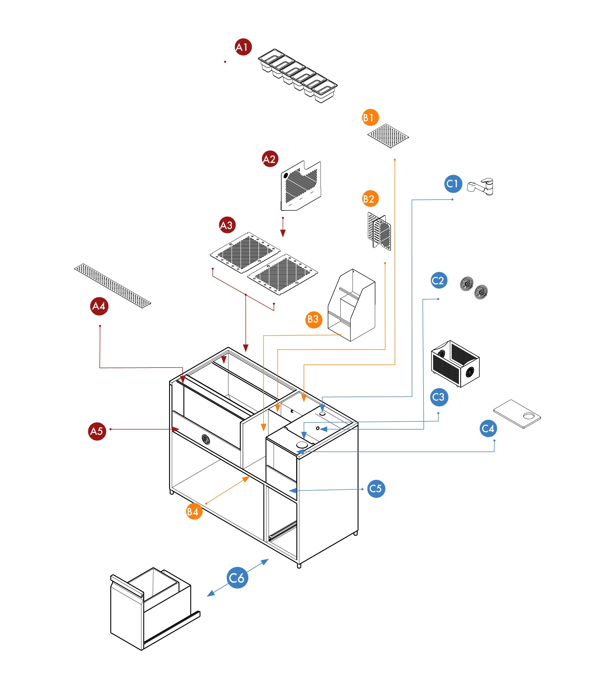 Bottlestep: Part of the Flexdock system, providing an elevated step for bottles, optimizing reach and display.